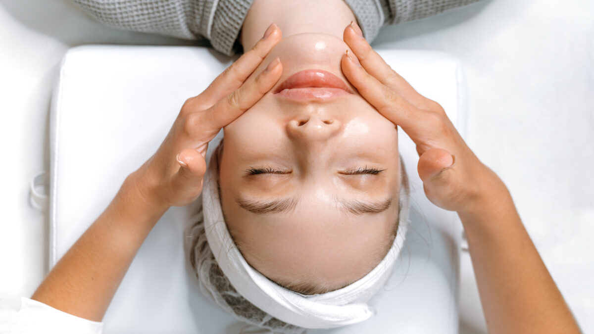 Facial beauty treatment. Face massage. Close-up of young beautiful caucasian woman getting spa massage treatment at beauty spa salon, woman masseur doing lifting massage to prevent wrinkles